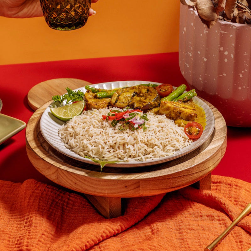 This dish features tender jackfruit paired with our coconut turmeric sauce, perfectly complemented by juicy cherry tomatoes, smoky aubergine, and long beans. The spices in the sauce add warmth and depth, while the coconut brings a rich, velvety smoothness to the curry. Served alongside fragrant basmati rice, it's the perfect vegetarian meal for anyone craving a comforting, flavourful dish with a touch of exotic spice.