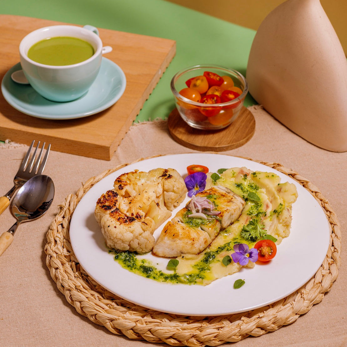Smokey Cauliflower & Seabass with Buttery Truffle Mash